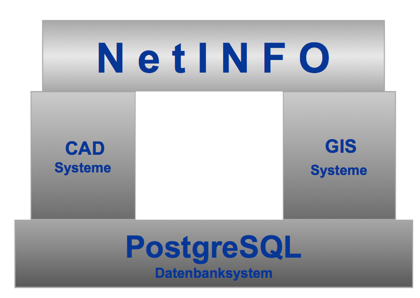 NetINFO basiert auf einem ORACLE Client-Server Datenbanksystem und der graphischen Planungssoftware AutoCAD. Für GIS Analysen wurden ESRI-Software-tools integriert.